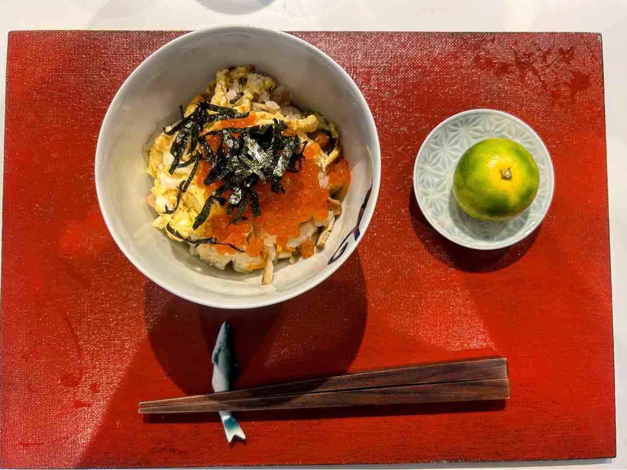 いくらをのせて、卵を焼いて、海苔をのせて完成