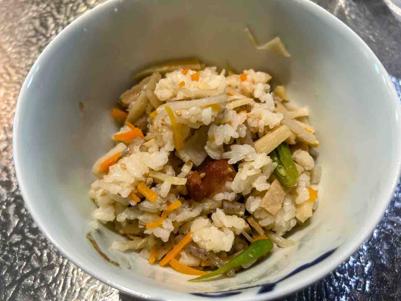 具材は、人参、蒟蒻、ごぼう、高野豆腐、筍、インゲン、油揚げ、蓮根、甘い豆